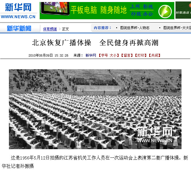 北京市体育局の李麗莉副局長は、労働者の健康について楽観視できない今、ラジオ体操はきわめて簡便な解決策だと期待している。今回 のラジオ体操復活も「健康北京人計画」の一環だという。同計画は2009年8月にスタート。全ての労働者は1日に1度、20分以上体を動かすことと規定している。