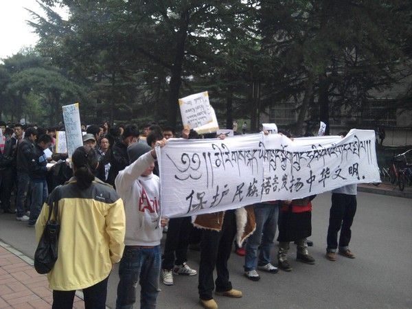 *ツイッターで広まっている22日付中央民族大学でのチベット人学生デモ。横断幕には「民族の言葉を守り、中華文明を発揚せよ」とある。