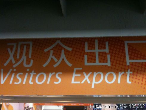 傑作なのがこちら。「出口」は中国語で輸出の意味。翻訳ソフトを使っていたのか、「Visitors Exports」(観客輸出)という傑作看板に。