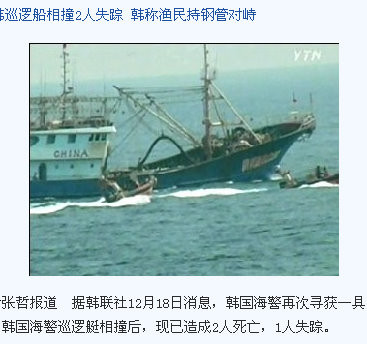 韓国海上警察、再び中国船員の遺体を発見(環球時報、2010年12月18日)記事そのものは、短いもので、この衝突により、2名が死亡し、行方不明者が1名出ていることと(後に1名、1名に訂正されましたが記事はそのまま)、韓国外交通商部が遺憾の意を表明し、中国側と善後策を協議することを明らかにしたこと等が報道されておりました。