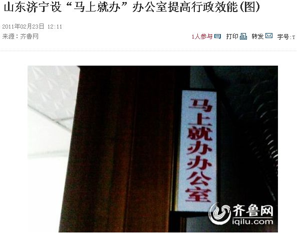 2011年2月、中国メディアは、山東省済寧市の「馬上就辦弁公室」(略称:馬上弁)について報道。注目を集め待ています。日本語訳すると、まんま「すぐやる課」。済寧市政府の各部局、各地区に100以上も設置されたそうで。