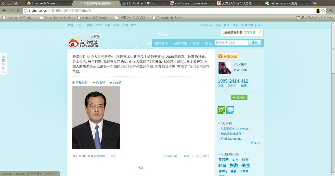 *当記事は2011年3月12日付ブログ「中国マイクロブログ(微博)雑記」の許可を得て転載したものです。