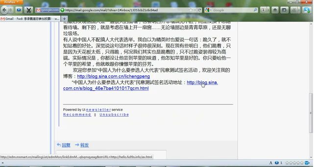 メールを開き、「http://blog.sina.com.cn/******」という、ある新浪ブログのアドレスをクリックする。このアドレス自体は正しいものだが、実際には別のサイトに飛ばされている。