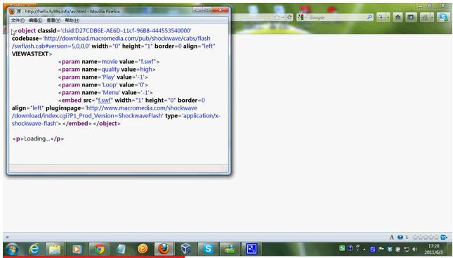 「Loading…」と表示されているのが、偽装リンクで飛ばされたハッキングサイト。アドレス欄を見ると、新浪ブログではない別のサイトを開いていることがわかる。そのソースコードを見ると、サイトにはフラッシュファイルが仕込まれていることがわかる。