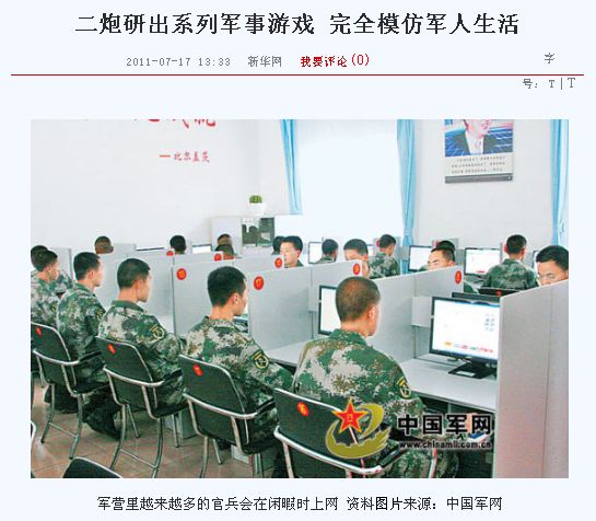 「軍事要請達標」というゲームは一種のバーチャルワールドを構築する世界。軍人の日常生活をゲーム世界で体験しながら知識を得たり、コミュニケーションを図ったり、紀律観念を養うことを目的としているという。アメーバピグのような、アバターを使ったコミュニケーションゲームのようだが、軍人のみなさんがバーチャルワールドでまで軍人ライフを送りたいのか、激しく気になるところ。
