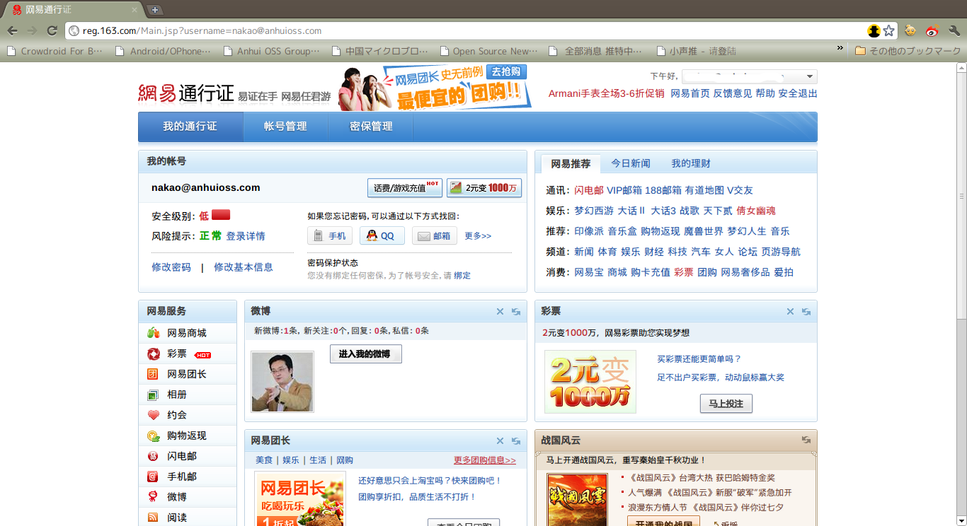ログイン後は様々なサービスと共に网易微博の情報が確認可能になります。