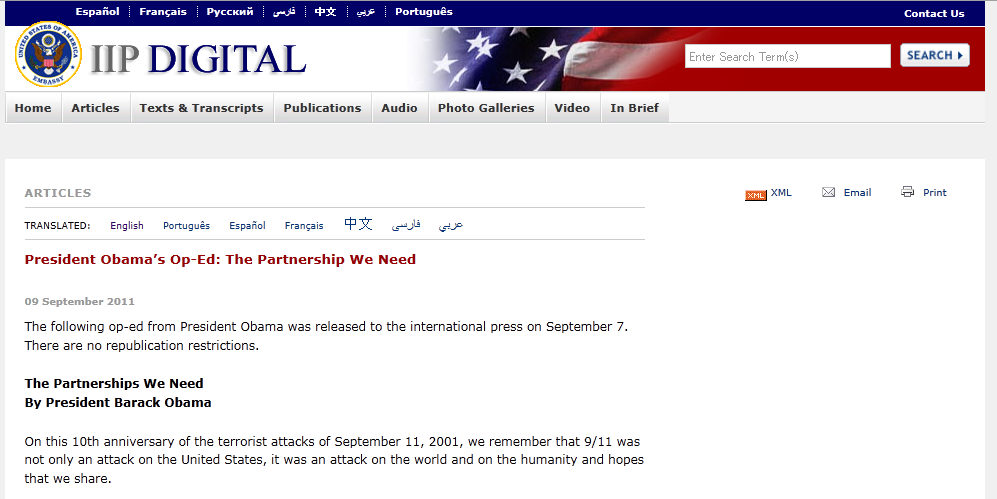 *画像は米国務省国際情報計画局ウェブサイト。オバマ大統領の寄稿文。