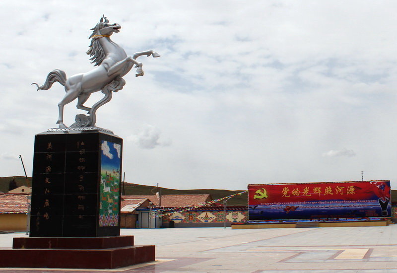 *マトゥ県広場。「党の輝きは源流を照らす」という赤い横断幕のスローガンが跳ね馬よりも人目を引く。