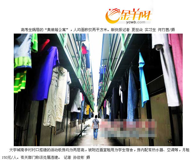 「狭いながらも楽しい我が家」でいいじゃないかと思わないでもないが、現地の街道弁公室は無認可で建設された違法建築だと指摘する。また、消火栓もなく避難通路も整備されていない設計。さらには無理やりシャワーまで詰め込んだのはいいが、温水器を使うとあたりにはガスの臭いが立ちこめるといったずさんな作りも問題となっている。住んでいる学生も「ガス漏れが怖くてシャワーが使えない」「むき出しのガス管が爆発したら一巻の終わり」と話している。