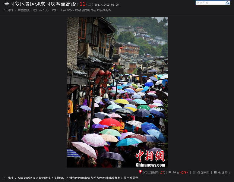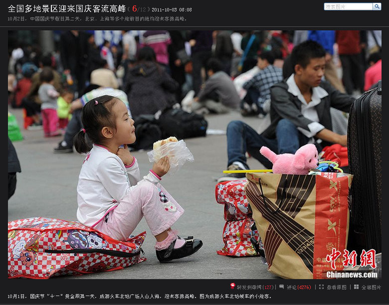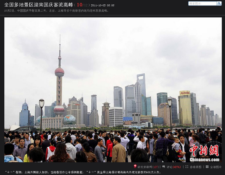 湖南省西部の古い街・鳳凰県。ひなびたいいところだったのだが、今では一大観光地に。成都北駅前。待合室に入りきれない人々が駅前で座り込み状態に。上海の観光地・バンド(外灘)。上海市にはこの1週間でのべ600万人の観光客が押し寄せる見通しだ。以上、画像は網易。他にも中国各地の混雑写真が掲載されている。