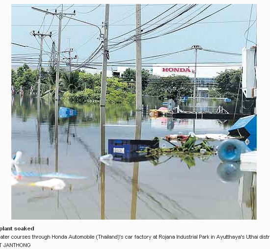 タイの洪水で、タイにおける自動車メーカー1、2位のトヨタとホンダは、明暗を分けてしまった。トヨタはサムート・プラカンとチャチェンサオにある3工場が(まだ)冠水しなかったのに対し、ホンダのアユタヤ・ロジャナの主力工場は3mの水に没した。
