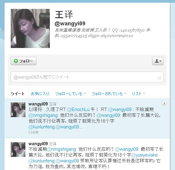 *2010年10月の程建萍さん(ハンドルネームは「王訳」)のツイート。