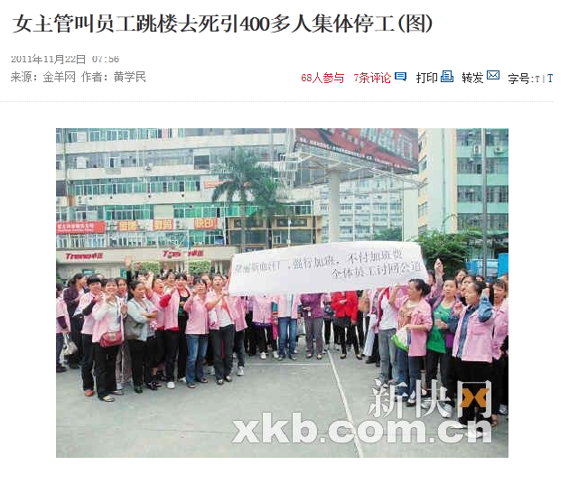 2011年11月22日、広東省深圳市の世界最大のブラジャー工場でストライキが起きた。「飛び降りて死ね!」という管理職の暴言がデモのきっかけになったと報じられている。