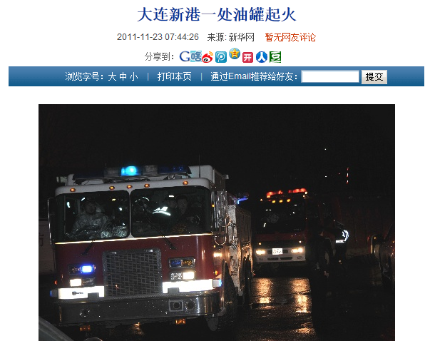 火災が発生したのは、大連市金州新区の大連集団タンク区にある31号タンク、32号タンク。落雷が原因となった。出火から1時間あまりで消火に成功、負傷者は報告されていない。