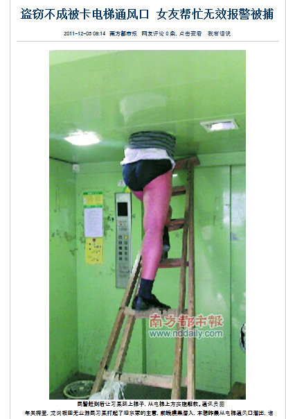 リストラの逆恨みで深圳のとある工場に盗みに入った「男性」が、エレベーターの通風口に忍び込も