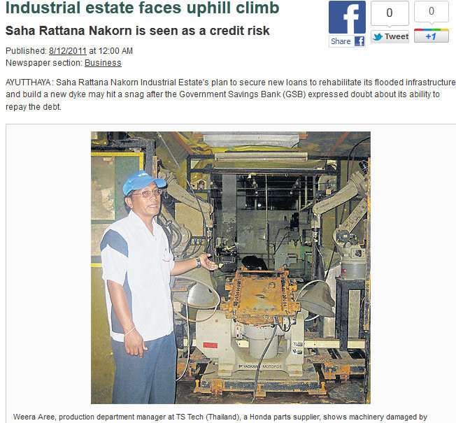 遅れているアユタヤの「サハ・ラタナ・ナコン」は、12月3日から排水を始め、終わり次第、ホンダの部品会社などが2012年第1四半期の操業再開を目指し、準備に入る。しかし、このサハ・ラタナ・ナコン団地は、GSB(政府貯蓄銀行)からの融資をうるのに苦労しているようだ。工業団地の返済能力が疑問視されているのだ。