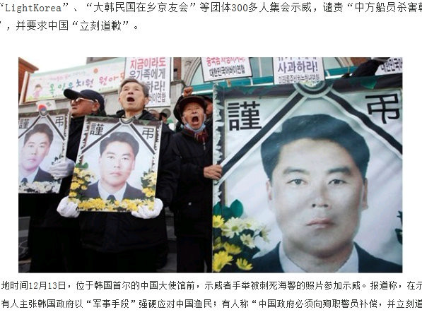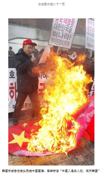 2011年12月14日付環球網によると、韓国各地で中国に対する抗議活動が展開されている。街中で中国国旗を燃やし、「中国人は殺人犯だ。韓国から出て行け」と書かれたプラカードを掲げる一幕もあった。