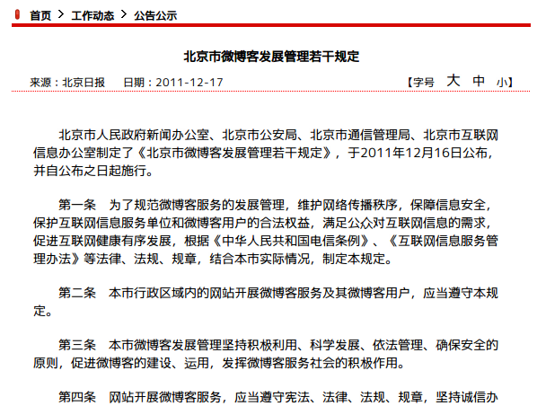 12月16日に北京市が16条からなる『北京市微博客发展管理若干规定』を施行し、中国の微博利用に関し身分証の提出を義務付け実質実名制になっていくことは既に日本語のニュースでもいくつか取り上げられているので、ご存じの方も多いでしょう。