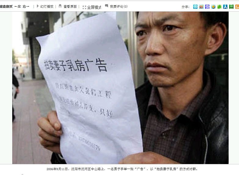 2011年9月11日、遼寧省瀋陽市。「妻のおっぱいをオークションにかけます」と書かれたチラシを持った男。