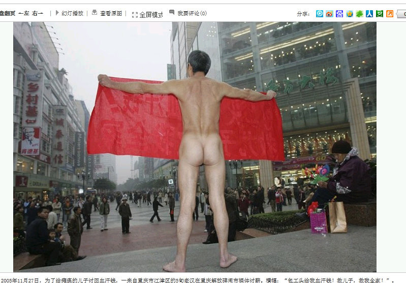 2005年11月27日、重慶市。繁華街で全裸になって訴える50代の男性。病気の息子のために給料を持ち帰らないといけないのに、建設現場下請け企業の親方が給料を支払ってくれないという。