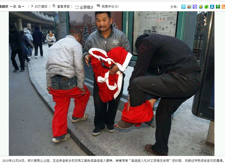 2010年12月24日、河南省鄭州市。サンタ・コスプレをする出稼ぎ農民。「サンタクロースが未払い給与を請求する理由を説明します」と書かれた札を持って繁華街を練り歩いた。