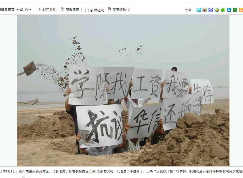 2011年8月9日、河南省鄭州市。メッセージボードを持った男たちが穴に埋められていくというパフォーマンス。
