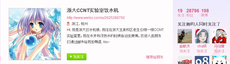 上記画像、二次元美少女画像をアイコンにしているのが「浙江大学CCNT実験室ウォーターサーバー」だ。マイクロブログ・新浪微博のアカウントで、ウォーターサーバーの状態が変化するとつぶやく仕組みとなっている。いわゆるBOTアカウント(ロボットの略称。プログラムにより人間の手を介さないでつぶやくアカウント)だ。