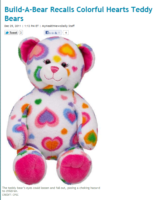 問題の「カラフル・ハート・テディベア」は全長16センチの熊のぬいぐるみ。白い体にカラフルなハートマークがいっぱいついているデザインだ。中国で製造され、今年4月から12月まで米国とカナダで約30万個が販売された。先日、安全性検査中に目の周囲の生地が弱いことが発覚。とれた目玉を子どもが飲み込んで窒息する恐れがあると分かった。