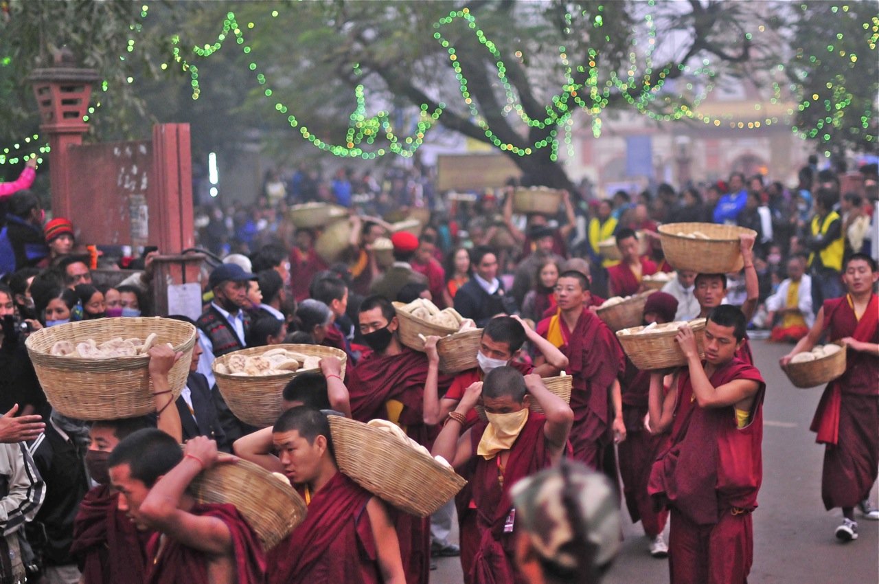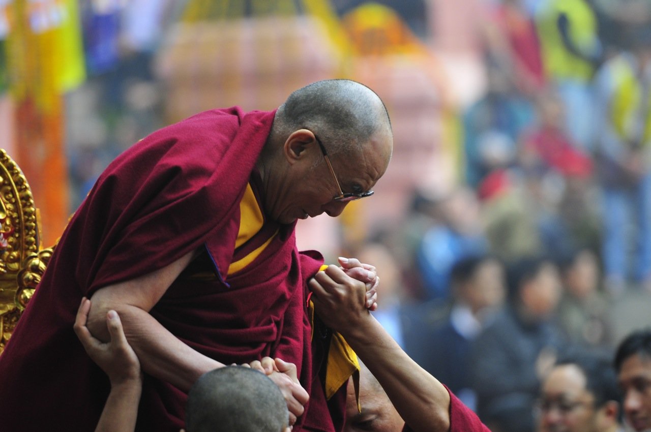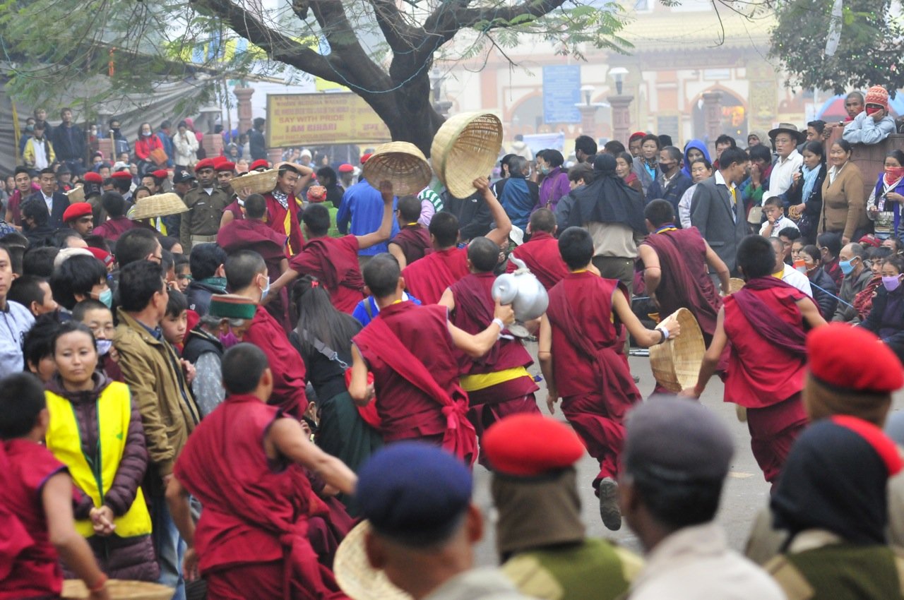 今日朝7時、濃い霧が立ちこめる中、手に手に白いカタを持つ沿道の群衆をかき分け、ダライ・ラマ法王は歩いて大塔に向かわれた。大塔の前でチベット仏教各派の代表ラマと共に、最近焼身抗議を行い死亡した同胞を弔い、安否不明になっている同胞の安寧を祈るためである。