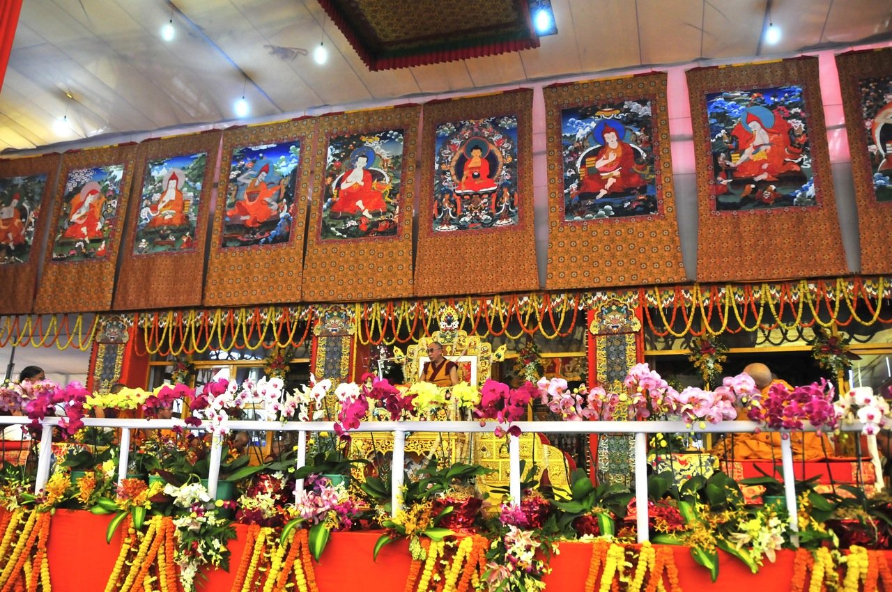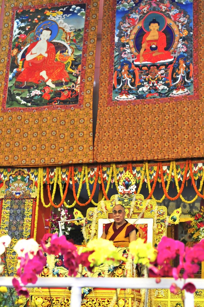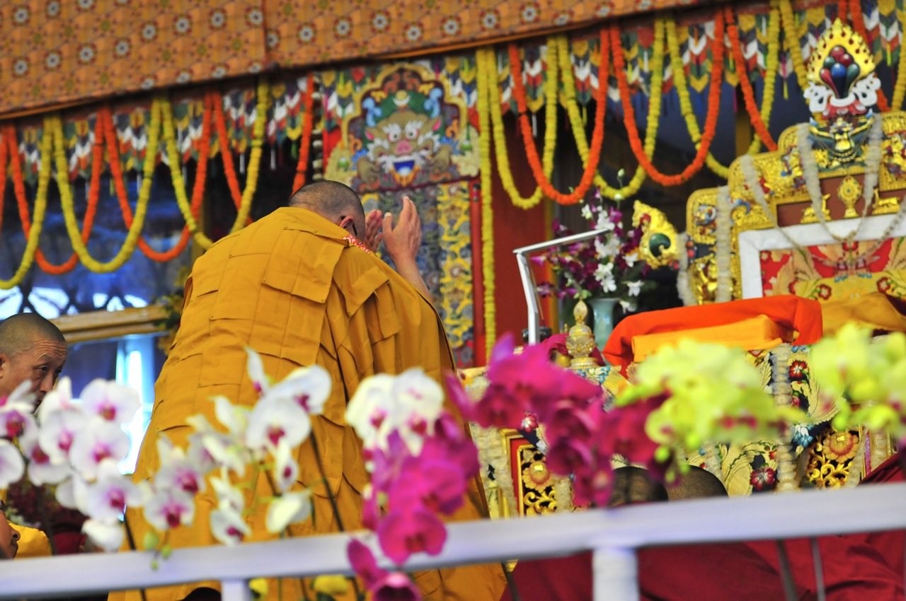 会場に入場され、まず説法を行う玉座に対し3度五体投地する法王。これは仏法に対し敬意を示すためである。