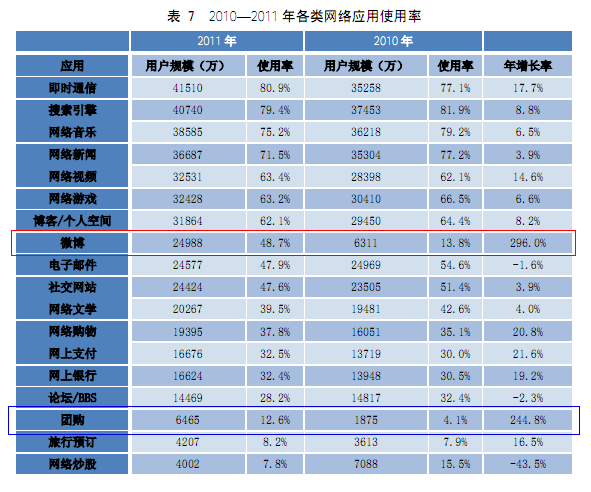 微博(マイクロブログ)ユーザーは、2010年末の6311万人から2011年末には2億4988万人まで増加しました。ネットユーザーの利用率は48.7%。ネットユーザーの2人に1人はマイクロブログを利用している計算です。ユーザー増加率は296%で、各種サービスの中でも最大です。
