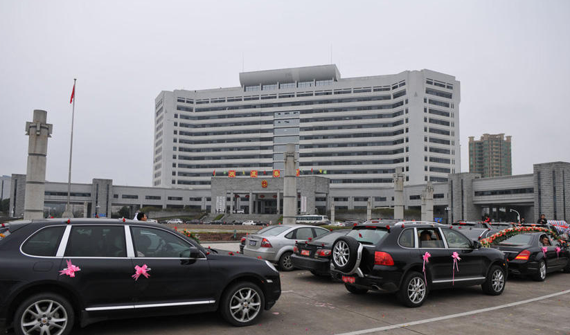 30日の正午、台州市市庁舎前広場に車の行列がやってきた。ピンクのリボンや花で飾り付けられた、「結婚車隊」だ。中国では結婚時に飾り付けした車に新婚カップル、親戚一同など関係者が乗り込んで、あたりを走り回るのは一般的な風習となった。富裕層だと、高級車やオープンカーを使うのも珍しくない。