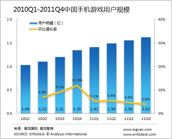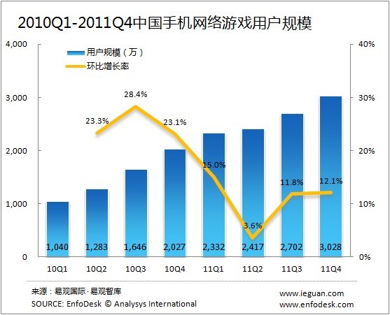 中国調査会社・易観国際から2011年第4四半期時点のモバイルオンラインゲーム市場のデータが公開されました(レポート1、レポート2)