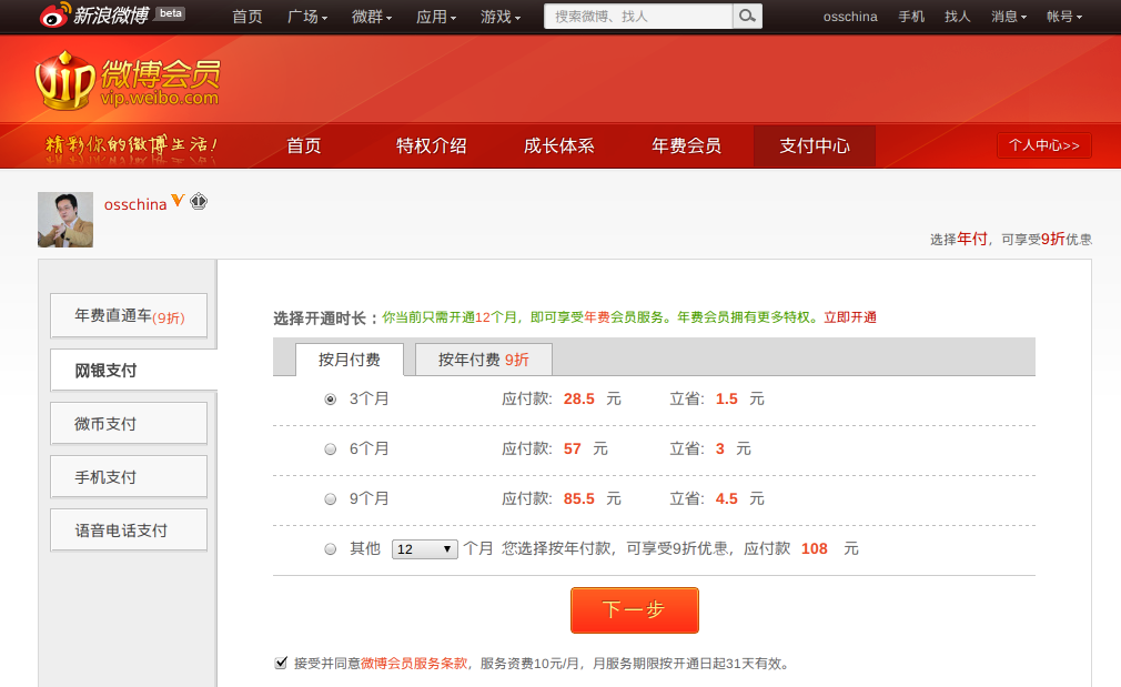支払い方法は、銀聯カードや新浪微博内のバーチャルマネー”微币”、携帯電話費用からなど多岐に渡り対応するほか、3ヶ月、6ヶ月、1年単位で申し込むことにより割引も行われるようです。