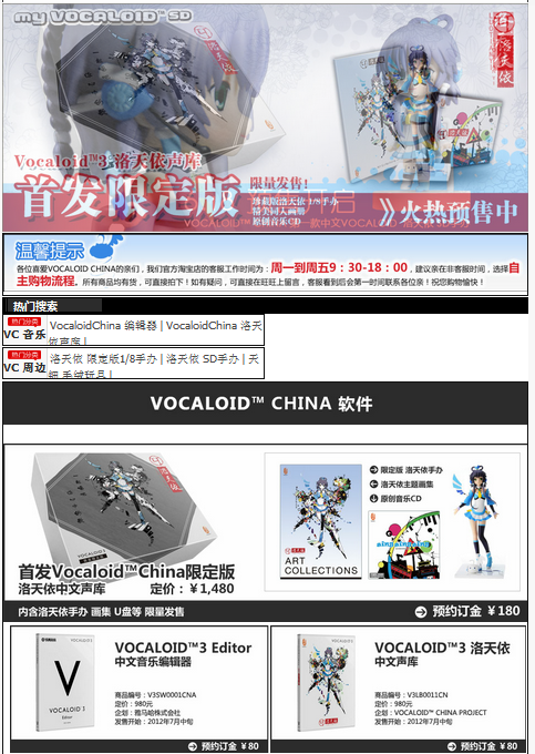 発売時期がイマイチはっきりしなかったボーカロイドチャイナの「洛天依」ですが、先日ネットの通販の予約も始まり、発売日も7月中旬とだいたいの所が決まったそうです。taobaoのオフィシャルネットショップではソフトに加えて初回限定版も発売されるようですね。(現在ページに出ている価格は、定価では無く予約の手付金です)
