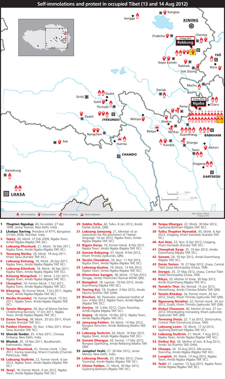 8月15日現在、内外合わせた焼身者54名の内42名の死亡が確認されている。内地チベットでの焼身51人、内死亡41名。