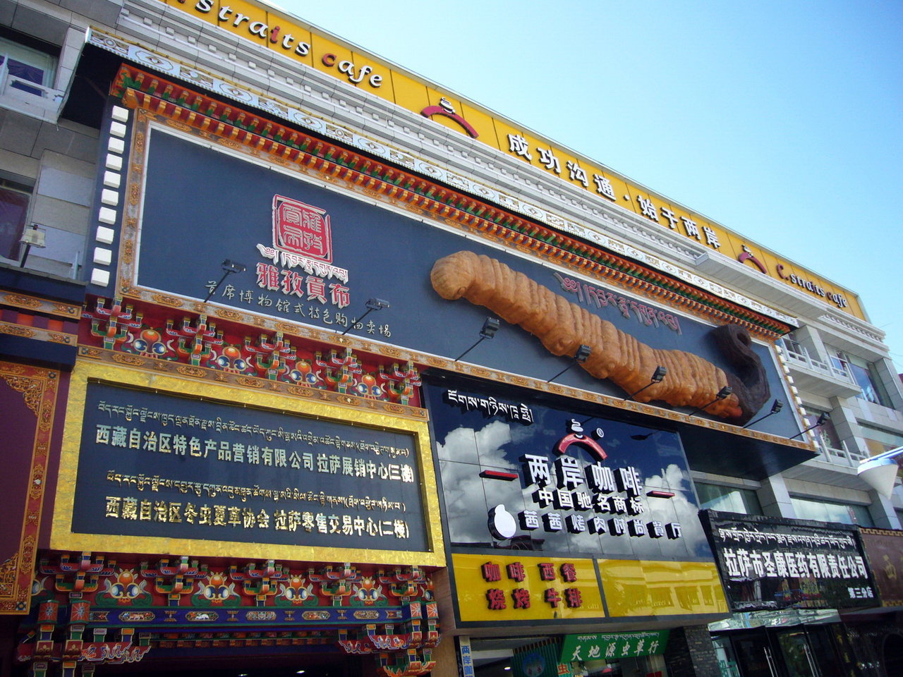 太陽島ではこのほか、各地の風味を楽しめるレストランやチベタン・マスチフ販売センター(壁にはパンチェン・ラマ10世の大きな写真が掛けられ、机には額縁に入った毛沢東の肖像が置かれている)、四つ星ホテル(洋食や中華、チベット、インドの各料理などを味わえる)、アダルト・グッズ店、ラサ民族文化芸術宮、ラサ市政府臨時弁公室などが入り乱れている。