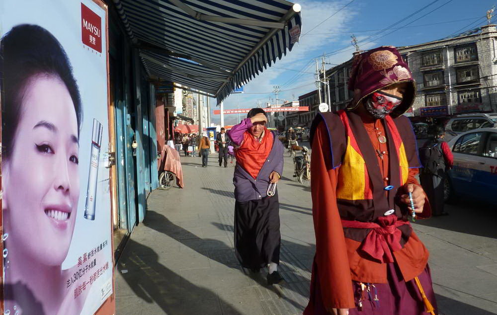 チベット人にすれば、五体投地をしていのるは素晴らしい巡礼者だ。彼らは肉体を痛める苦行によって敬虔な信仰心を表現する。頭を下げ、敬意を表する価値がある。しかし、チベット文化の記号が氾濫する寄せ集めの中では、はかり知れない功徳を意味する神聖な行為は逆に「懲罰」と見なされる。冗談だとしてもあまりに度を越している。本物のチベットはこうした笑いの中、はっきりと低く評価され、辱められ、冒涜されている。