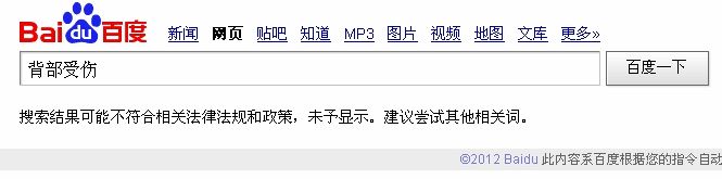 読売新聞が「習近平は背中を負傷」と報じたのが影響しているのか、百度では早速「背部受傷」(背中負傷)という単語が「捜索結果可能不符合相關法律和政策,未予顯示.建議嘗試其他相關詞」(法律法規や政策に合致しない恐れがあるため、検索結果を表示できません。似た単語で再度検索してください)とNGワードになっているようです。新浪微博も同様の制限がかかっています。