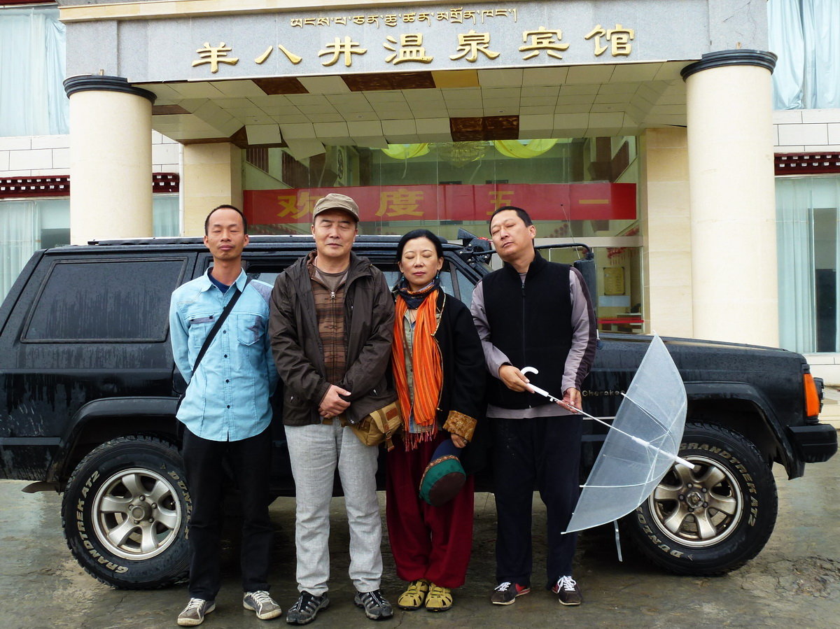*その後、ラサ手前のヤンパチェン(羊八井)で再び止められ、夜遅くにとても高価なヤンパチェン温泉賓館に泊まるしかなかった。私たちは道中、記念写真のスタイルで、「目を閉じてチベットを見ない」というパフォーマンスを演じた。写真で私たち(朱日坤、王力雄、私、王我)は目を閉じている……。