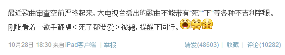 最近、楽曲の検閲が空前の厳格さとなっている。主要テレビ局では「死」「下」(下野の意)など不吉な漢字を使った曲は放映してはならないんだと。さっき、「死了都要爱」をカバーした歌手がひっかかっていた。同業者に忠告(T^T)