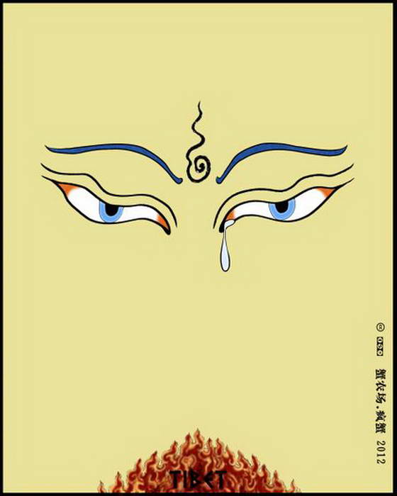 *2012年11月22日、アムド地方レゴン(青海省黄南チベット族自治州同仁県ドワ郷)で、18歳の遊牧民ルンブム・ギェルが焼身抗議した。2009年以降で84人目となる焼身。画像は漫画家の瘋蟹が描いた「ブッダの涙」。