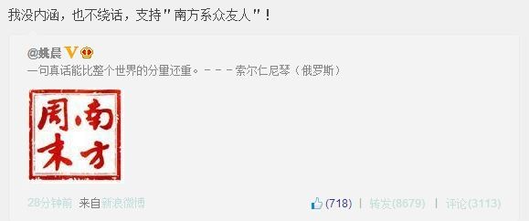 (南方週末のロゴ画像を掲載して)「一片の言葉の真実は世界全体よりも重い」(ソルジェニーツィン)
