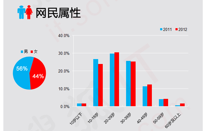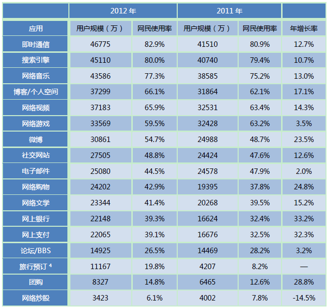 即时通信(チャット、インスタントメッセンジャー)ユーザーは2011年末比で12.7%伸び、4億6,775万人になりました。こちらQQは登録ユーザーが7億人、そして微信(WeChat)はユーザー数が間もなく3億人などと言われていますが、1人で双方のアカウントを持っていたり、同じサービス内でも複数アカウントを持っていたり、というのを除外して計算しているのでしょうね。