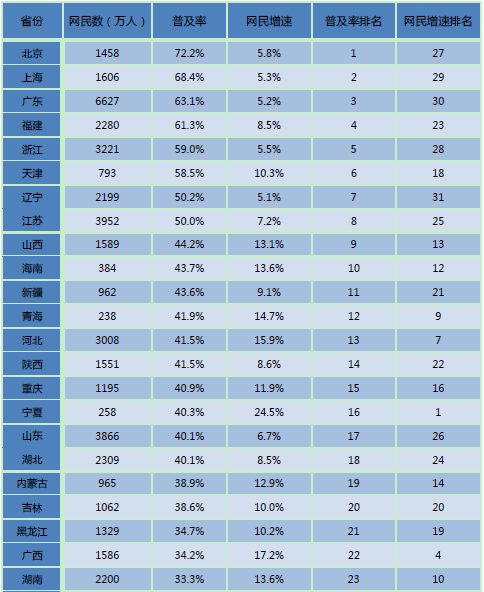 普及率の高い順に省・市が並んでいます。やはり上位は北京市、上海市、広東省といった先進地域。ただ全国平均を上回っているのは11位の新疆ウイグル自治区まで。それ以下の20省は平均値以下です。私が現在住んでいる安徽省なども1,869万人のネットユーザーがいながら、その普及率は31.3%と平均を10%も下回っています。