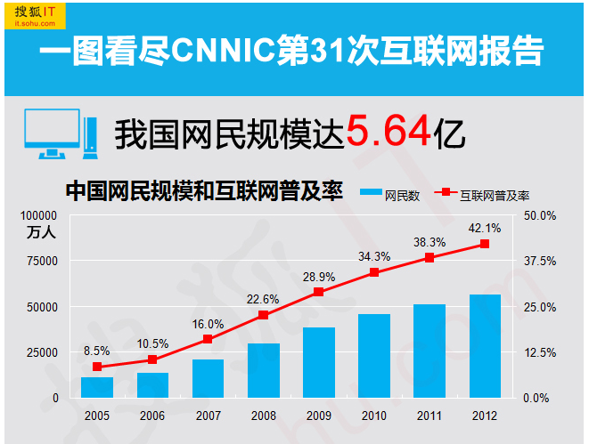中国インターネット・レポートの定番、中国インターネット情報センター(CNNIC)の最新版報告書《第31期中国インターネット発展状況統計報告》が発表されました。今回は捜狐ITが作成した、CNNICレポートに基づくインフォグラフィックを含めて紹介したいと思います。