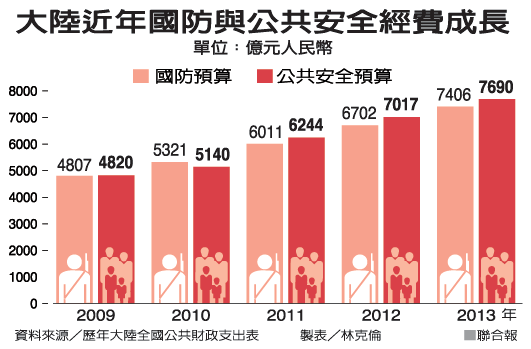 聯合報によると、中国の治安維持経費は7690億元(約11兆5000億円)に達している。2010年から3年連続で治安維持経費が国防費を上回っている。