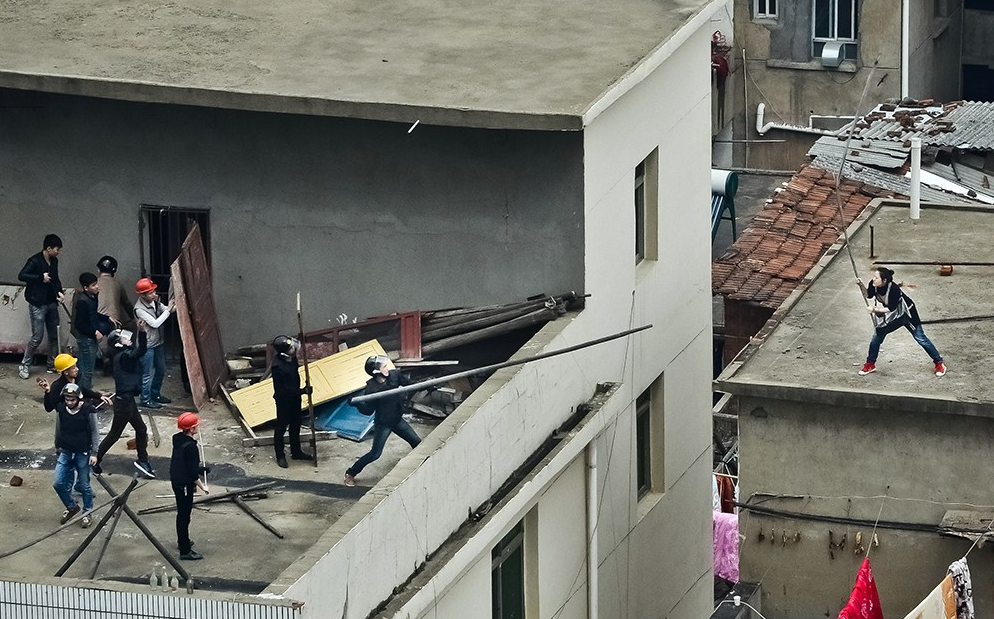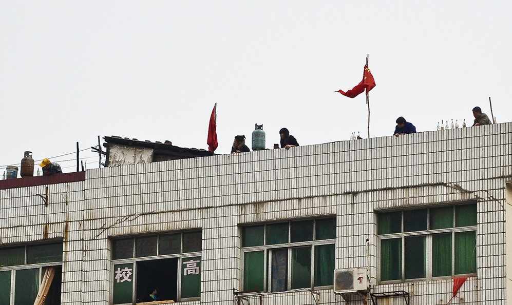 *屋上でもプロパンガスを準備。瓶に見えるものは火炎瓶か。旗は我らが五星紅旗。国家の正義に期待して国旗を掲げたり国家を歌ったりというのも定番。