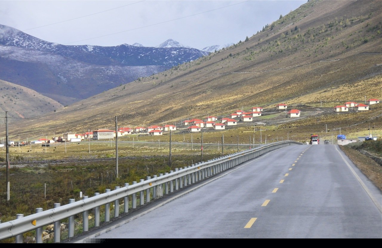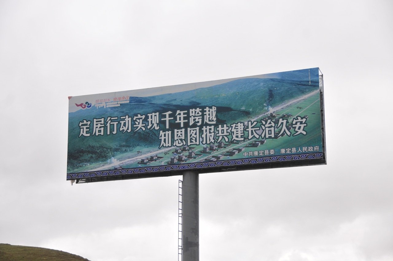 カム地方ミニャック・ラガン地区の幹線道路沿いに立てられた巨大看板。日本語訳「(伝統的移動牧畜をやめ)定住プロジェクトは1000年の飛躍、その恩恵を忘れず末長く安定した社会を共に建設しよう」。