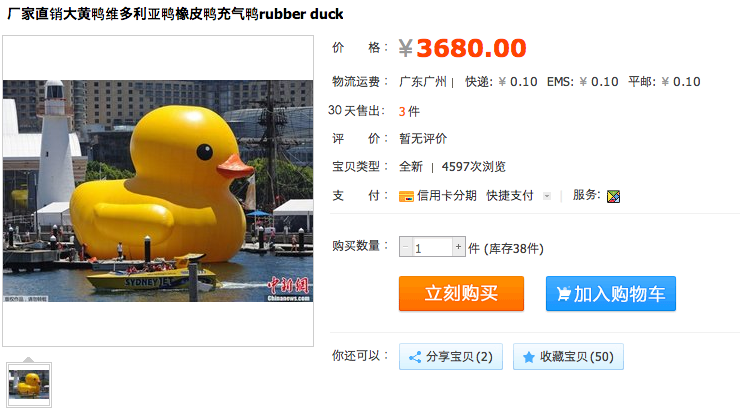 淘宝網でも巨大アヒルが販売されているのを確認。お値段は高さ3mで3680元(約60,000円)から、本家を大きく超える20mのものは何と149,800元(約240万円)。でも偽物。